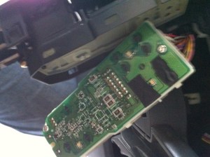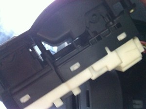 Here’s a side-view of the controls removed from the door. I used a small flat-tip screwdriver to push up on the black plastic to get the white tabs out.