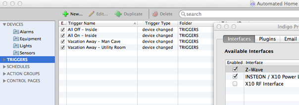 I setup an L2TP VPN server on the iMac again and was able to re-use my Vitamin D Video Pro license with OS X. Setting up home automation on the iMac was a more expensive prospect. After reviewing several different products I decided to purchase Indigo 6. I’m not sure I would have made this move yet if they hadn’t recently added Z-Wave support (I have a mix of X10, Insteon, and Z-Wave devices).