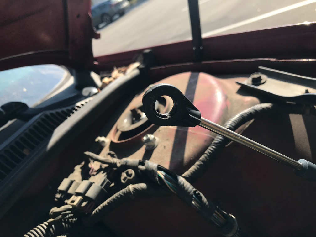There’s a much longer story here but I’ll shorten it up considerably. A buddy of mine met us there and helped me get it going so we could drive it back to my place and work on it. The failure was very simple – the piece of plastic that connects the shifting cable to the top of the transmission had failed.